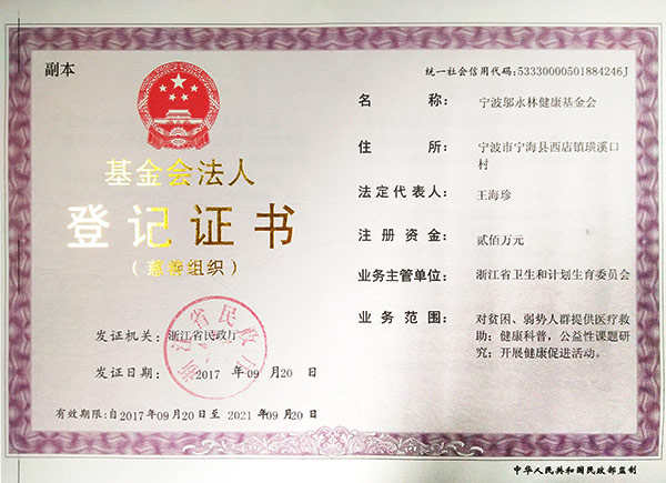 宁波邬永林健康基金会,成立于2010年10月,是在浙江省民政厅注册、由浙江省卫生健康委主管的非公募基金会。基金会的原始基金数额为人民币贰佰万元,来源于万搏在线(中国)股份有限公司。《慈善法》颁布后,本基金会被认定为慈善组织。